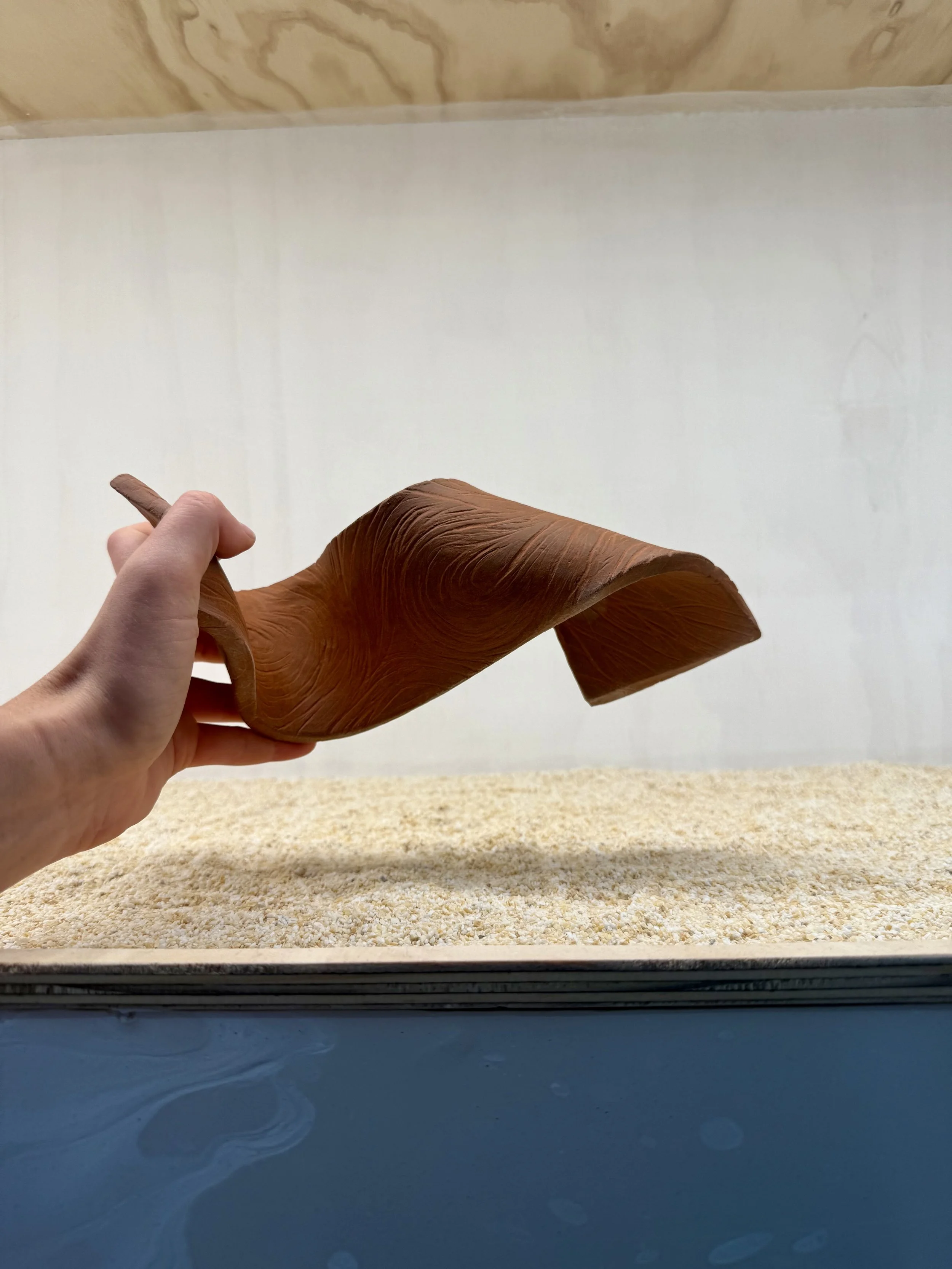 The primary inspiration for my Living Belonging is the fond childhood memory of my father sweeping the footpath outside of our house every morning, captured through abstraction in its path-like form and the flowing lines that travel along its surface.I utilised ‘Red Earth’ clay to create my Living Belonging as it is symbolic of the Australian land that my father tirelessly maintained despite being a Filipino immigrant. This notion of respecting land is intrinsically tied to Australia's history, whilst the idea of 'respect regardless of ancestral heritage' is evident in Australia today as old traditions and Indigenous culture continue to be taught and maintained.My linework has been meticulously carved with various hand-tools, creating details that mimic patterns found in nature. Upon feeling the textures on the sculpture’s surface, audience members' hands and fingers transform into the metaphorical broom tasked to maintain and care for my Living Belonging.